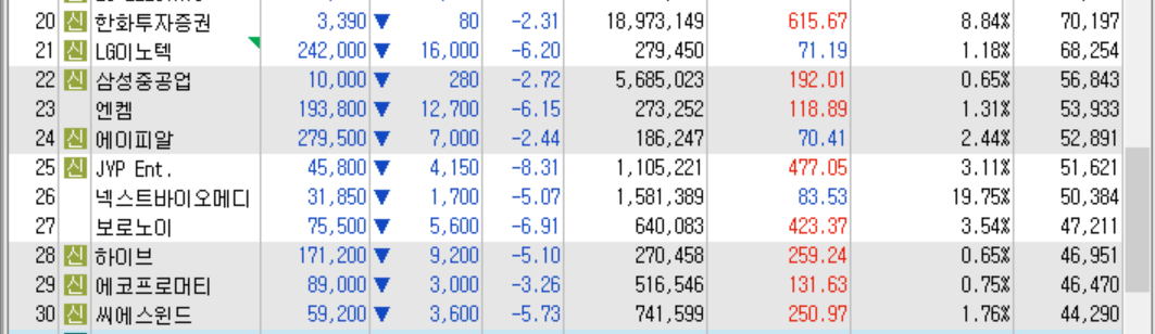 • 당일 거래대금 상위 1~15위 또는 30위까지의 주가 상승률 +5% 이상